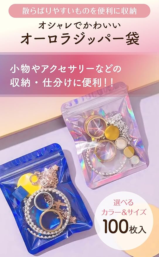 【小さめサイズのオーロラチャック袋】コンパクトなサイズのオーロラチャック袋は、缶や小さなジュエリーなど細かいアイテムの整理に最適です。ブルーの鮮やかなオーロラカラーが、収納物をおしゃれに彩ります。100枚セットでたっぷり使えるので、日々の整理整頓がより楽しくなります。
