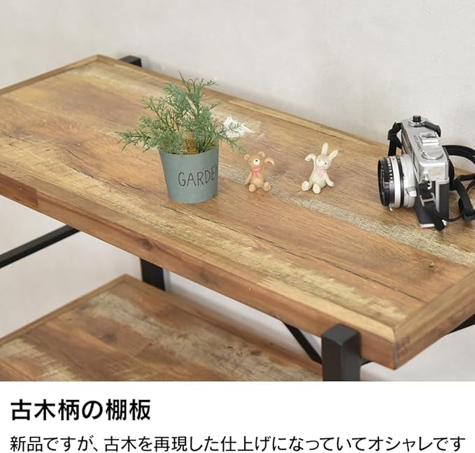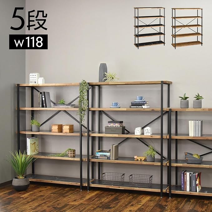 【5段ラック】アイアンと木材を掛け合わせた幅118cmの5段ラックの販売です。小物や本の収納、ディスプレイに最適です。厚さ30mmの棚板を備えた、迫力あるFJシリーズです。
