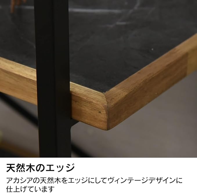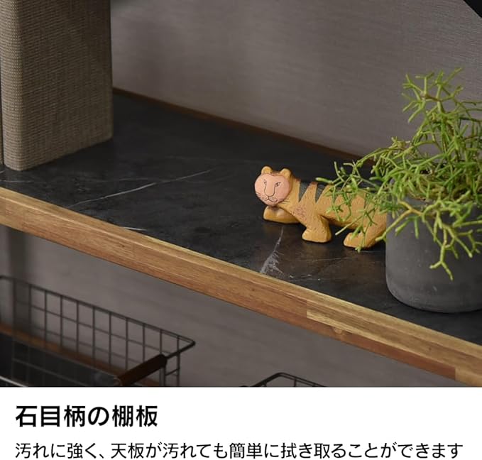 【特徴】天板・棚はメラミン貼りですので熱・キズに耐性があります。エッジ部にはアカシア天然木を使用しました。ブラウン(木目柄)とダークグレー(石目柄)の2色からお選び頂けます。