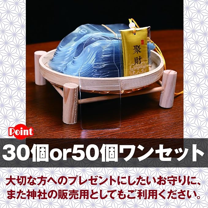 同サイズの商品を30個、もしくは50個ワンセットでお届けします。大切な方へのプレゼントにしたいお守りに、また神社の販売用としてもご利用ください。