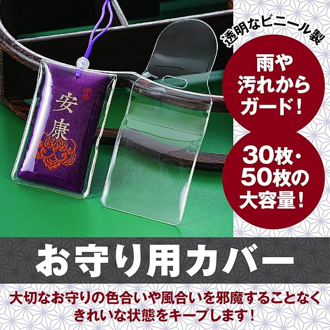お守りを雨や汚れからガード!ビニール製のお守り袋、お守り用カバーのセットです。一般サイズのお守りに適したサイズ。大容量でのお届け、破損時の交換用にもどうぞ!