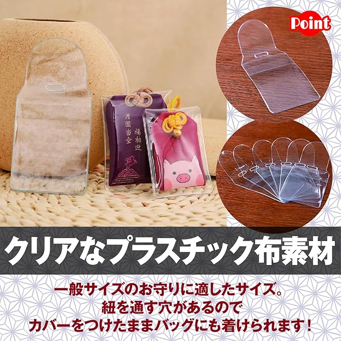 クリアなプラスチック布素材を使用。大切なお守りの色合い、風合いを邪魔することなく、きれいな状態をキープします。紐を通す穴があるので、カバーをつけたままバッグに着けてもOK!