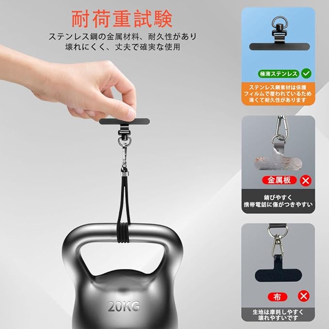 ✨【金属ステンレス製 - 耐久性抜群】:このスマホホルダーは高品質のステンレス素材を採用しており、耐久性と強度に優れています。表面は電気メッキされており、丸みを帯びているため、滑らかで繊細で、傷がつきにくく、長期間使用しても錆びたり、損傷したり、劣化したりしません。カプラー付きの「D」字型金属リングにより、強度と安定性が大幅に向上し、耐荷重は10kg以上に達します。スマートフォンを紛失・落下から守ります。