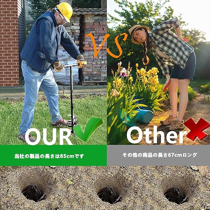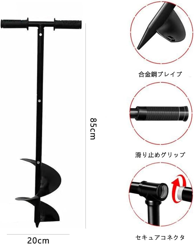 2.【ドリル仕様】この手動式アースドリルには4つの仕様があります。(縦85センチ、直径10センチ/縦60センチ、直径10センチ/縦85センチ、直径15センチ/縦85センチ、直径20センチ)。幅広いグリップはゴムスリーブで接続されています。ゴム袖の表面テクスチャ設計により、より良いグリップ力を提供します。