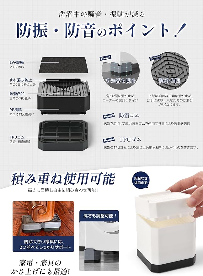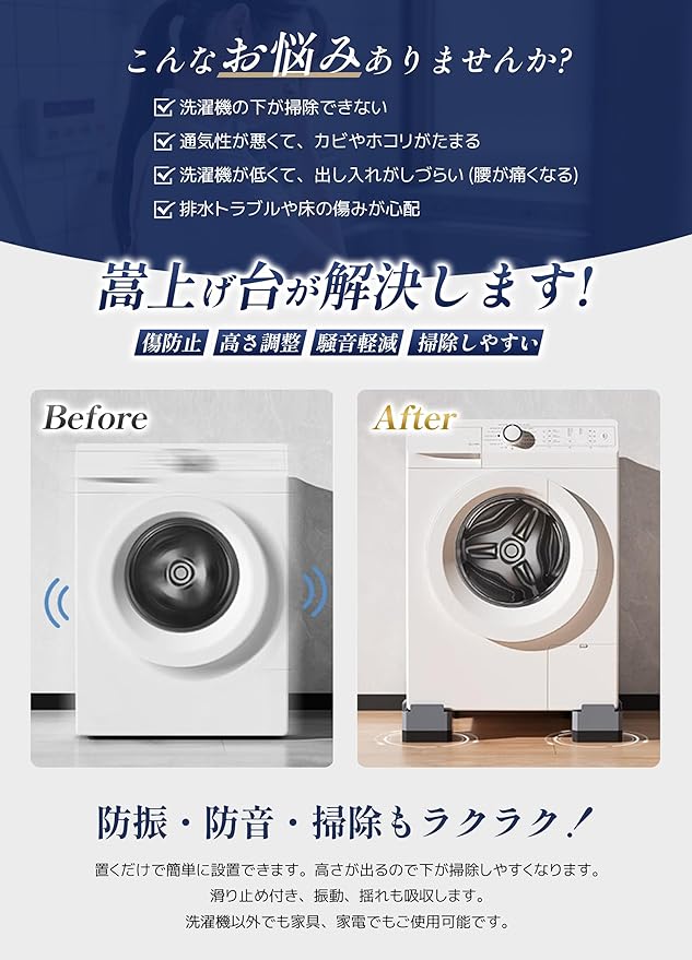 【取り付け簡単、防振、緩衝、防音に】地震による振動、衝撃、揺れを最小限的に抑え、転倒、ズレ、散乱を効果的に防ぐことができます。置くだけ簡単設置,接着不要で簡単に防振・防音効果が得られます。付属の静音パッドは、使用時にかさ上げ台の上に置くだけで、騒音を吸収するだけでなく、接触面の摩擦も効果的に減少し、洗濯机の足と家具の足をさらに保護します。