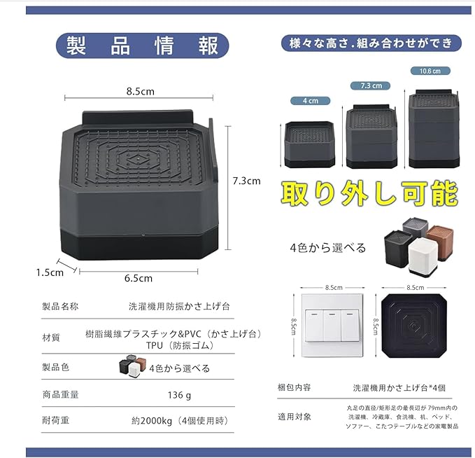 【洗濯機かさ上げ台】 サイズ:8.5L x 8.5W x 4H cm(1層)。セット内容:4個入り。耐荷重:約2000kg(4個使用時)。※適用対象:丸足の直径/矩形足の最長辺が79mm内の洗濯機、冷蔵庫、食洗機、机、ベッド、ソファー、こたつテーブルなどの家電製品・家具(85cm以上はつなぎ合わせる必要があります)。