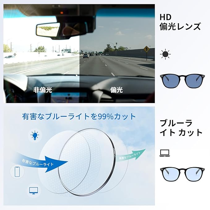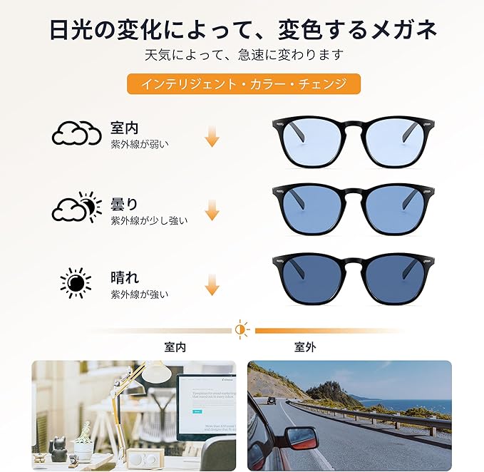調光サングラス:1本で2通りに使える調光レンズ。紫外線量と温度によって色が変わる調光レンズ。屋外など紫外線量の多い場所ではサングラス、室内など紫外線量の少ない場所ではクリアなメガネになるため、メガネとサングラスをかけ替えるわずらわしさがなく、人気のレンズです