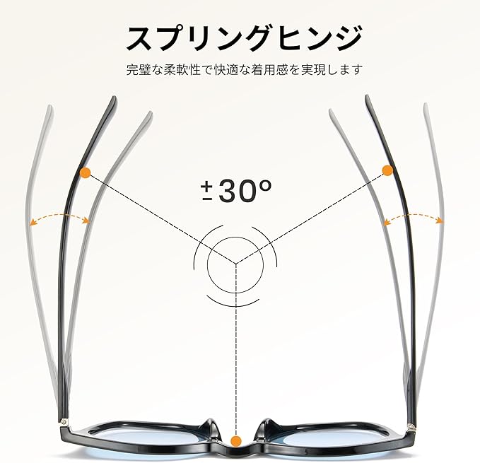 TR90素材でよい掛け心地:TR90(グリルアミド)超軽量素材を採用され、なめらかで快適なフィット感で、普段メガネ着用しない方でも違和感なくかけられます。改良されたヒンジを採用され、耐久性に優れており、耐摩擦性も備えております。鼻パットにはソフト素材を採用し、滑りにくく、長時間掛けても鼻にはセキを残さず、鼻への負 担も軽減してくれます