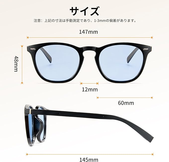 サイズ;レンズ横幅:60mm、レンズ縦幅:48mm、ブリッジ:12mm、テンプル:145mm、フレーム幅:147mm