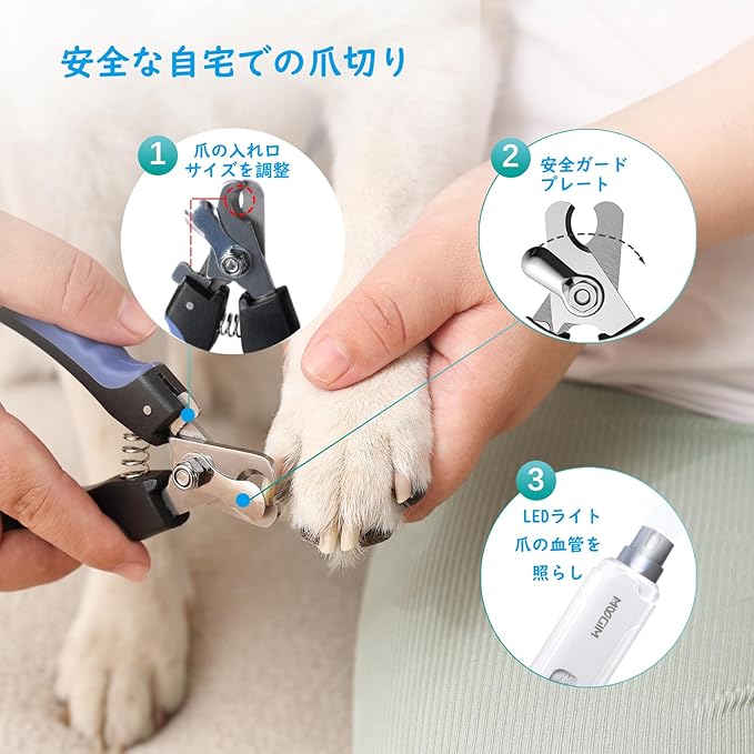 【安全な爪切り】このペット爪切りは、4段階の歯の位置ロック機能を備えており、使用時にはペットの爪の大きさに合わせて刃を適切な位置にロックします。その後、爪の先端から少しずつカット。余分な部分は電動爪とぎで研磨します。電動爪やすりはLED機能が付いており、高輝度LEDライトでペットの爪の血管を照らし、爪を傷つけることによる出血を防ぎます。