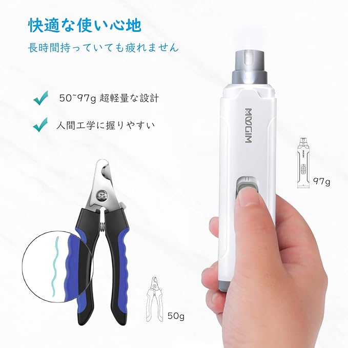 【快適な使い心地】このペット爪切りと電動爪ヤスリは、に基づいてデザインされており、握りやすく超軽量(50グラムから97グラム)です。これにより、女性や初心者のペット飼い主でも、長時間使用しても疲れずに簡単にペットの爪のお手入れができます。
