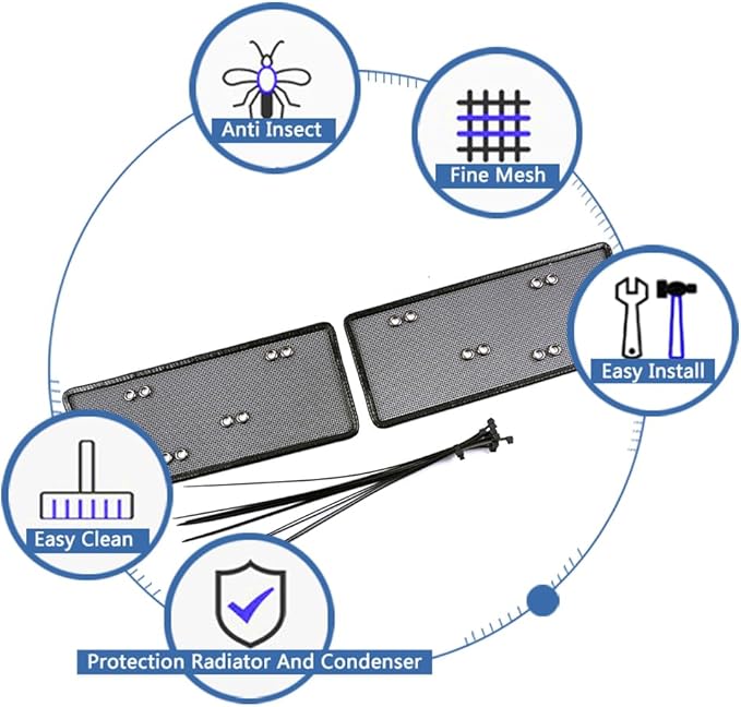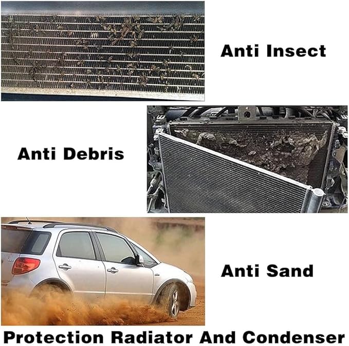 【車を保護】当社の車用防虫スクリーングリルで、車を破片、蚊、その他の危険から守ります。 ラジエーターとエアコンのフィルターを保護するように設計されており、焦げ付き防止コーティングが付着を防ぎ、長期間使用しても表面を清潔に保ち、空気の流れを妨げません。 車両の防御機能をアップグレードして、安心して運転できます。