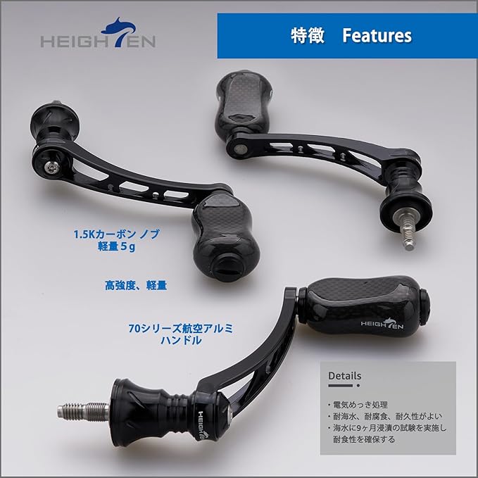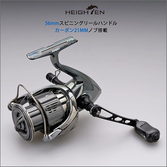 【サイズ】ハンドル軸心距離56mm、ノブ21mm(幅)x15mm(厚) 【総重】23g(シマノ用)/19g/(ダイワ用)【素材】ノブ-1.5K炭素布のカーボン、ハンドル-70航空アルミ 。