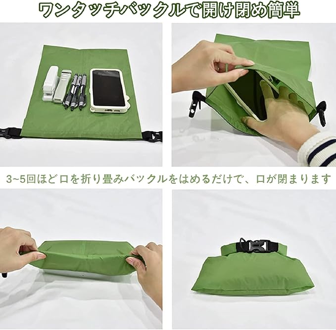 【軽量 & ポータブル】防水バッグは軽量で、持ち運びに便利な小さなサイズに折りたたむことができます。荷物を入れたら開口部をクルクル丸めバックルで留めると中に砂や水が入りません。