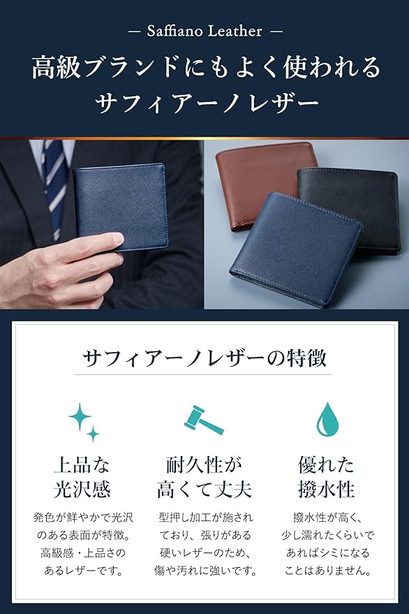 【サフィアーノレザー3つの特徴】❶上品な光沢感/鮮やかで光沢のある表面。❷耐久性が高くて丈夫。❸優れた撥水性/撥水性。少し濡れたくらいであればシミになることはありません。