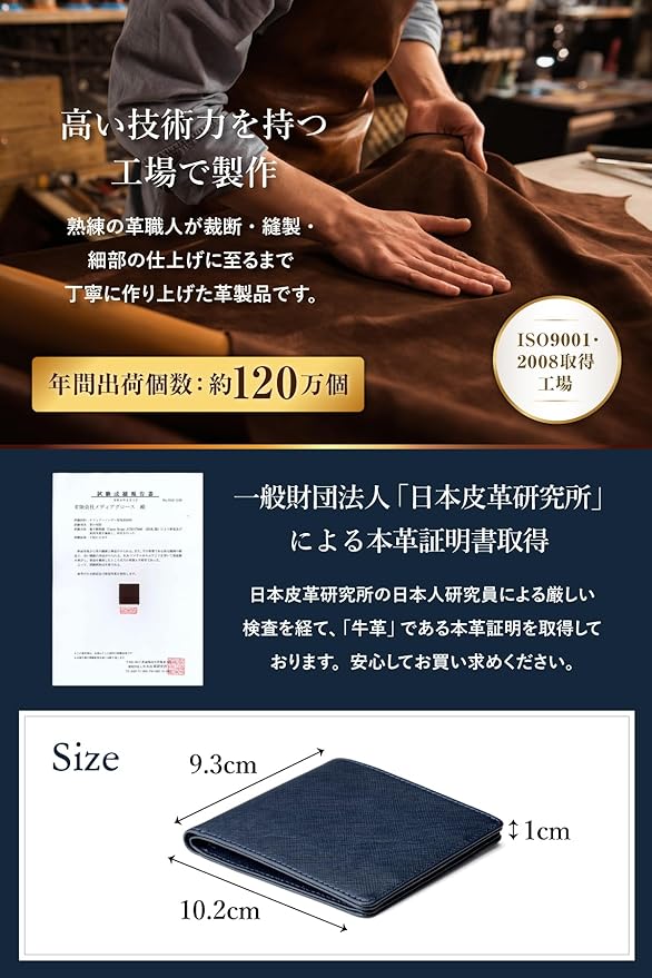 【本革証明書取得】一般財団法人「日本皮革研究所」の日本人研究員による厳しい検査を経て、「牛革」である本革証明を取得しております。