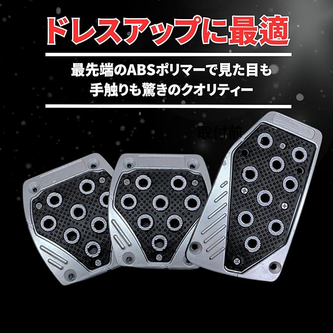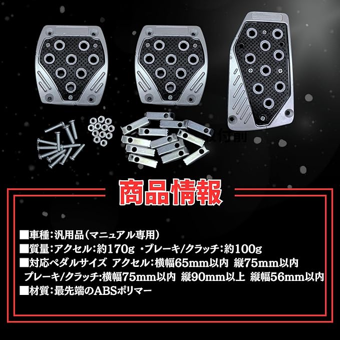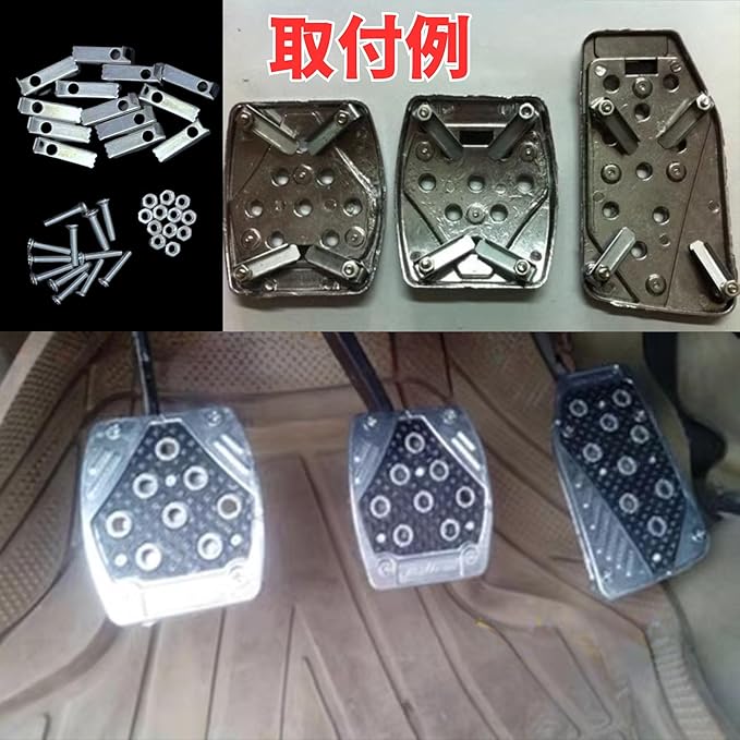 (ドレスアップ初心者も大満足)このペダルパッドの取り付けは簡単。特別な工具や穴あけ作業は一切不要です。専用付属金具を使って純正ペダルを挟むだけで取り付けられます。セットには、アクセルペダル、クラッチペダル、ブレーキペダルのペダルカバーが入っており、すぐに装着してスポーティーな雰囲気を楽しむことができます。