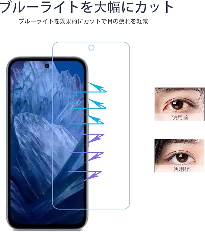 【対応機種-2+2 枚セット】Google Pixel 8a 用 ブルーライトカットガラスフィルム(2枚入り)+カメラフィルム(2枚入り)。【ブルーライトカット機能 】スマホの長時間使用による眼精疲労などを緩和します。【注意】(色あいなど画像と若干の違いがある場合があります。予めご了承下さい。)