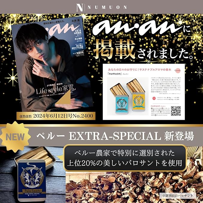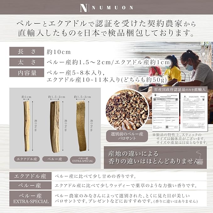 【 サステナブルなアロマ】 .契約農家では、自然に枯れて(平均寿命 40 年)倒木したパロサントの木を分解して、天日で自然に3~5年乾燥させたものを職人が1本ずつカットしています。 本パロサントは、自然と環境に配慮したサステナブルなアロマです。なお、自然倒木した木が、枯れていく過程で長い時間をかけて獲得する濃厚な香りは、香木の中でもとくに香りの持続性が高いと言われています。※パロサントは自然倒木した木を長期間寝かせたまま乾燥させるため、虫食いの痕がある場合がありますが、それが本物のパロサントの証です。