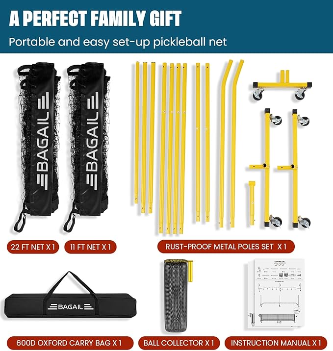 BAGAIL ポータブルピックルボールネットセット ホイール付き 22フィート 規定サイズ & 11フィート ハーフコートサイズ 2イン1 ピックルボールネット ボールコレクター付き キャリーバッグ付き 屋外 屋内 私道に