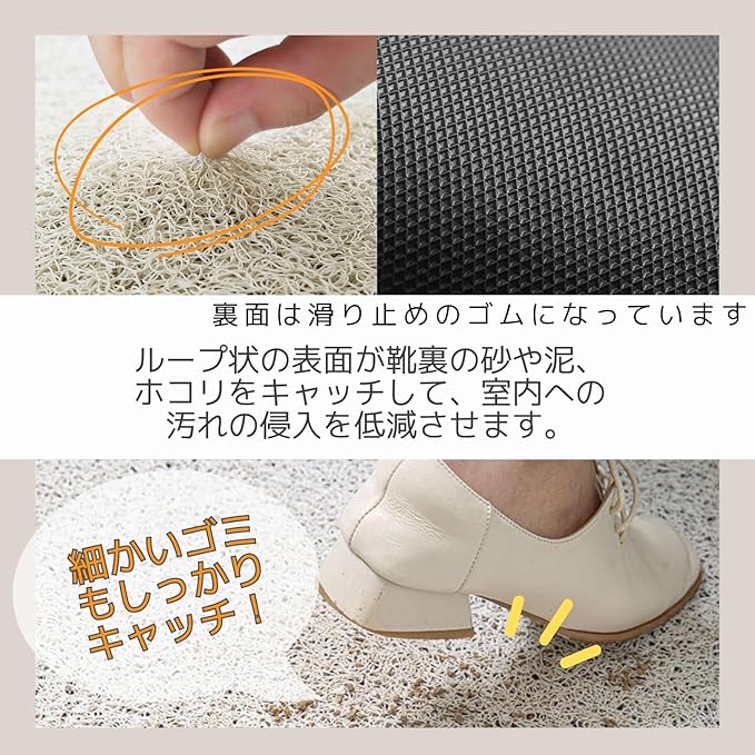 ループ状の表面が靴裏の砂や泥、ホコリをキャッチして、室内への汚れの侵入を低減させます。裏面は滑り止めのゴムになっています。