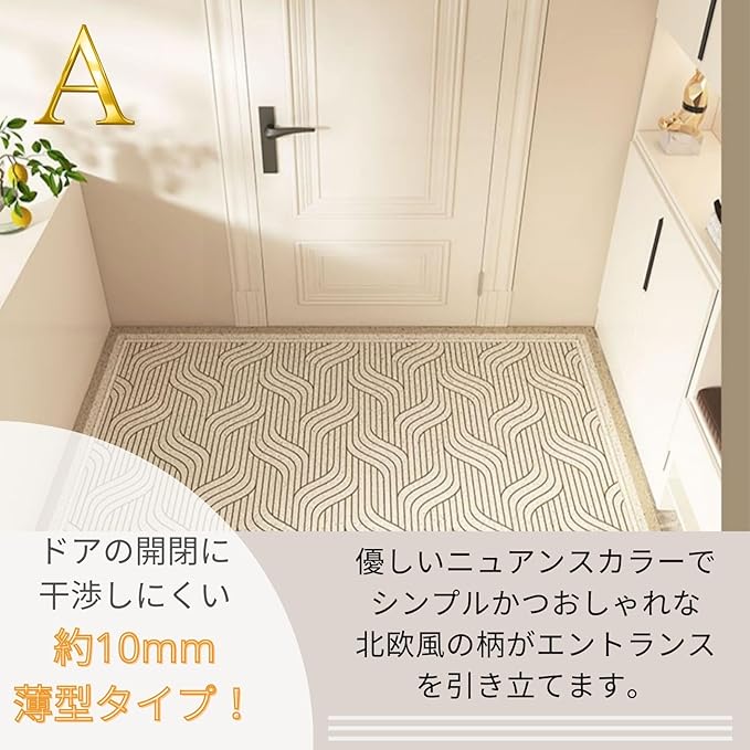 優しいニュアンスカラーでシンプルかつおしゃれな北欧風の柄がエントランスを引き立てます。ふみ心地がやさしく、ドアの開閉に干渉しにくい、約10mm薄型タイプです。