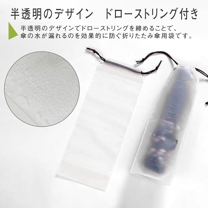 ●半透明のデザインでドローストリングを締めることで、傘の水が漏れるのを効果的に防ぐ折りたたみ傘用袋です。