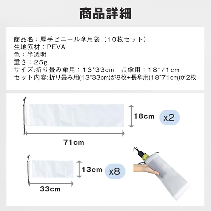 ●折り畳み傘用の13*33cmが8件、長傘用の18*71cmが2件、合わせて10点セットが入っているので傘の長さに合わせてご利用できます。