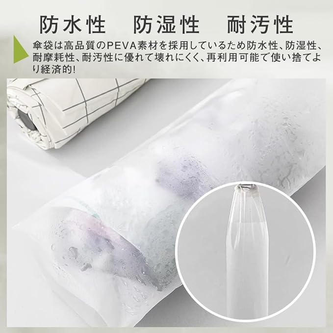 ●傘袋は高品質のPEVA素材を採用しているため防水性、防湿性、耐摩耗性、耐汚性に優れて壊れにくく、再利用可能で使い捨てよりエコで経済的!