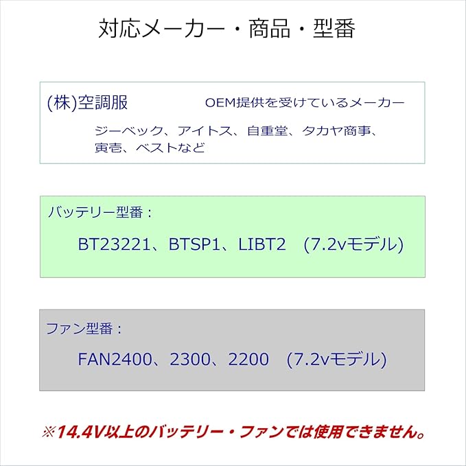 【対応機種】 ・(株)空 調服 ※OEM提供を受けているメーカー名:ジーベック、アイトス、自重堂、タカヤ商事、寅壱、ベストなど ・.型番:BT23221、BTSP1、LIBT2(7.2vモデル) ・ファン型番:FAN2400、FAN2300、FAN2200(7.2vモデル) ※14.4v以上のモデルでは使用できません。