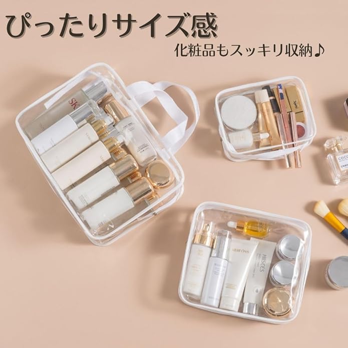 【ちょうど良いサイズのセット】化粧品や小物の整理にぴったりのサイズ感で、スッキリ収納できます。洗面用具、歯ブラシなど、サイズに応じて大中小のポーチに仕分け・収納することができます。