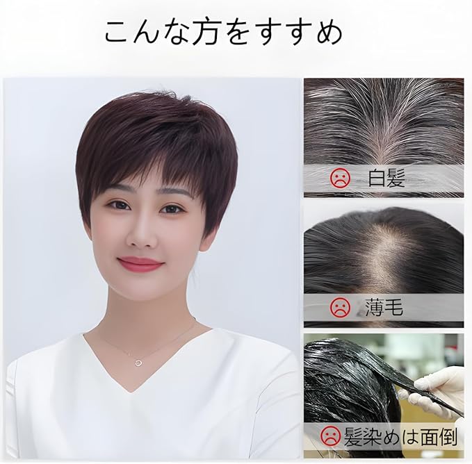 注意事項】:こちらの商品はを使用しているため、白髪が混ざっているものもございます。不良ではございませんのでご了承お願い致します。もし商品に何か問題と提案があれば、いつでもお気軽にお問い合わせください。至急対応させていただきます。自髪の色と若干色差が生じる場合、その際自髪と一緒にウィッグ色より濃い色を染めって頂ければ、より自然な形になります。