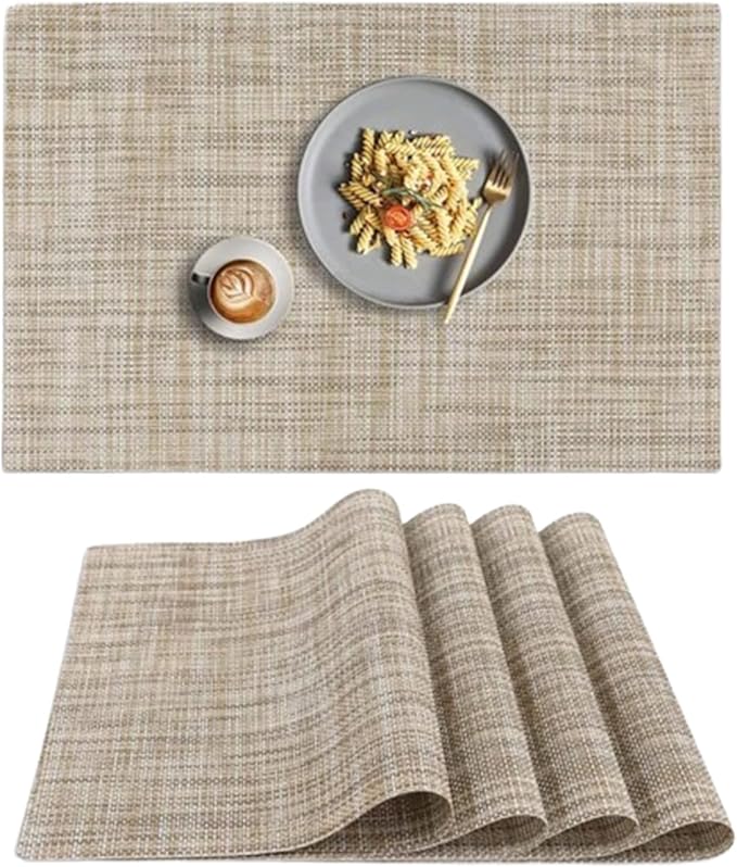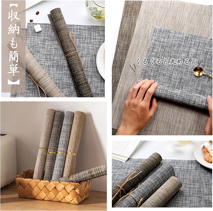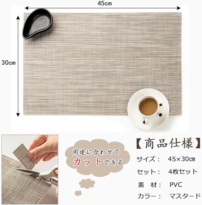 【商品仕様】サイズ:(約)45 30㎝、セット:4枚セット、素材:PVC(ポリ塩化ビニール)、環境に優しい素材で、滑り止め、断熱の性能が持ちます。カラー:マスタード、高級感のあるプレースマットは、食器を引き立て、食卓を美しく彩ります。