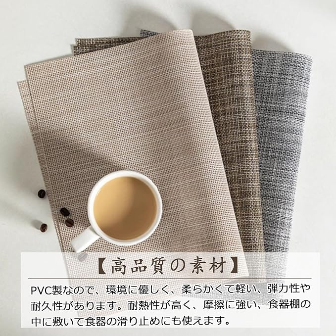 【高品質の素材】PVC製なので、環境に優しく、柔らかくて軽い、弾力性や耐久性があります。耐熱性が高く、摩擦に強い、食器棚の中に敷いて食器の滑り止めにも使えます。布の生地に比べ、PVCの方がかびが生えていない、油がつかない、お手入れ簡単です。いつも新しいように見えます。