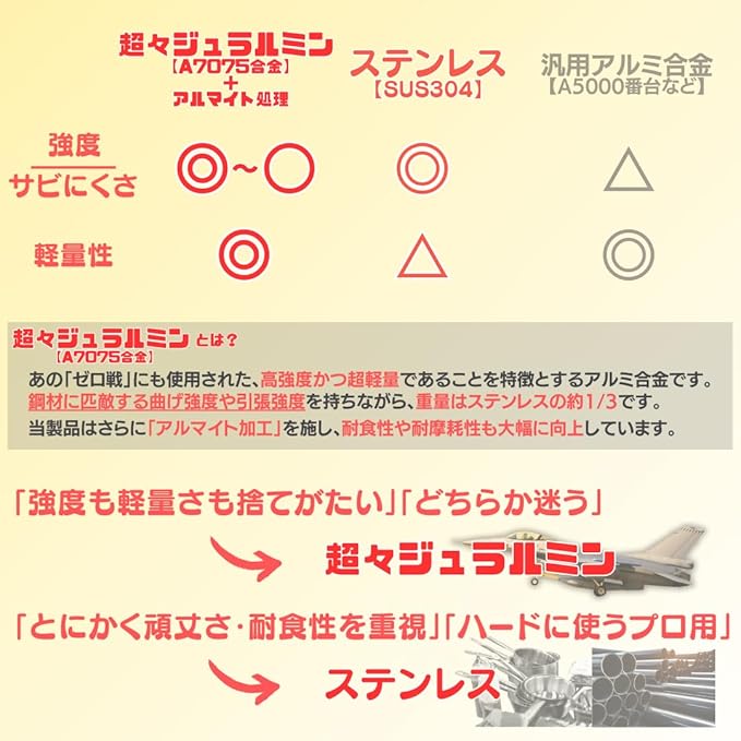 材質 超々ジュラルミン(A7075):軽量かつ高強度。航空機部品にも使用されます。