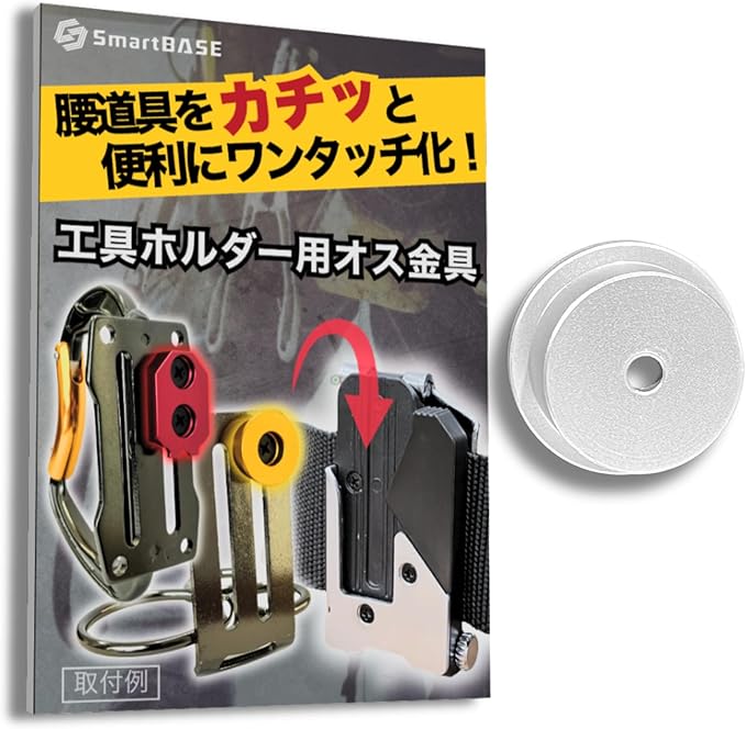 腰道具をカチッと便利にワンタッチ化!!:工具や道具袋が市販のワンタッチ工具ホルダーやコンベックスホルダーにワンタッチ着脱可能になる、SmartBASEオリジナルの腰道具カスタム用金具です。
