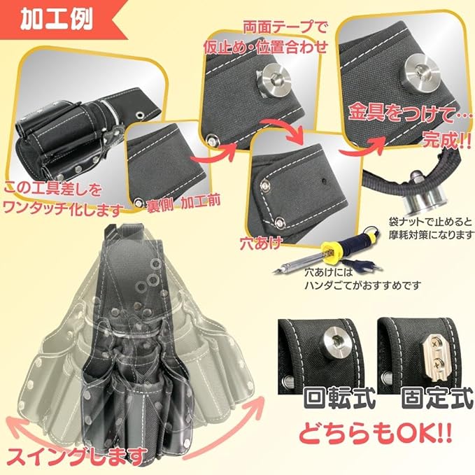 使用方法:当商品(金具)を、お好きな工具の裏側に取り付けるだけ!ねじを取りける穴がない場合も、簡単な加工で穴をあけて取り付けることができます。例えば、化学繊維製の腰袋なら、ライターで炙ったクリップ等でほつれなく穴を開けられます。簡単に詳しくは商品説明動画を御覧ください。