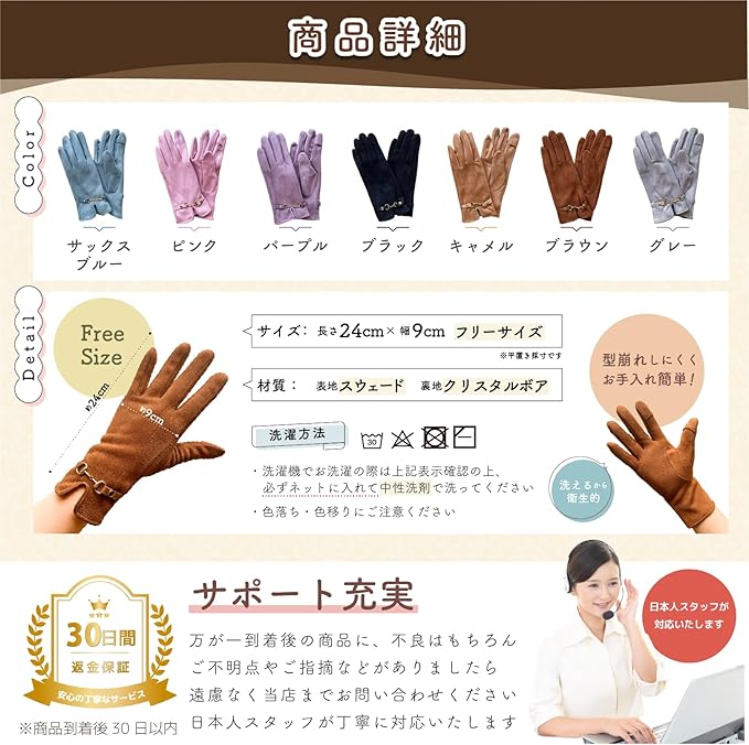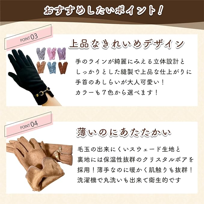 スウェード生地で柔らかく、裏地は高密度クリスタルボア生地で暖かくソフトな肌触り