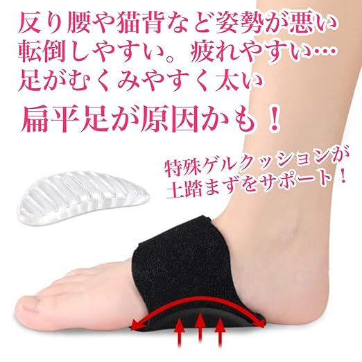 【偏平足が原因かも⁉】反り腰や猫背など姿勢が悪い、転倒しやすい、疲れやすい、足がむくみやすく太いなど…偏平足が原因かもしれません。土踏まずサポーターを着用して理想的な足裏アーチに!