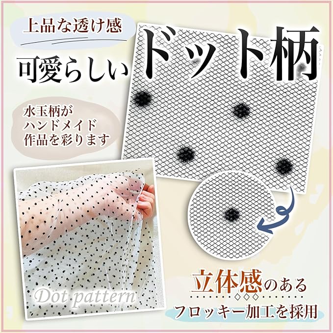 メッシュ地にフロッキーの水玉が乗ったソフトチュール生地です。 豊富な色のバリエーションで、お好みに合わせて楽しむことができます。