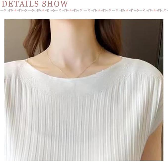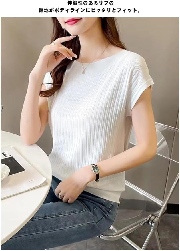 サマーニット 春 夏 秋 レディース 接触冷感 リブ ニット 半袖 トップス 薄手 プルオーバー ゆったり フレンチスリーブ 着痩せ ボートネック カジュアル フェミニン 涼しい ひんやり インナー 大きいサイズ 通勤-ホワイト||M | oioioichan