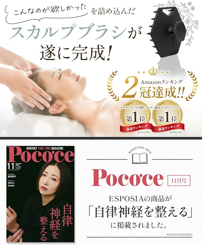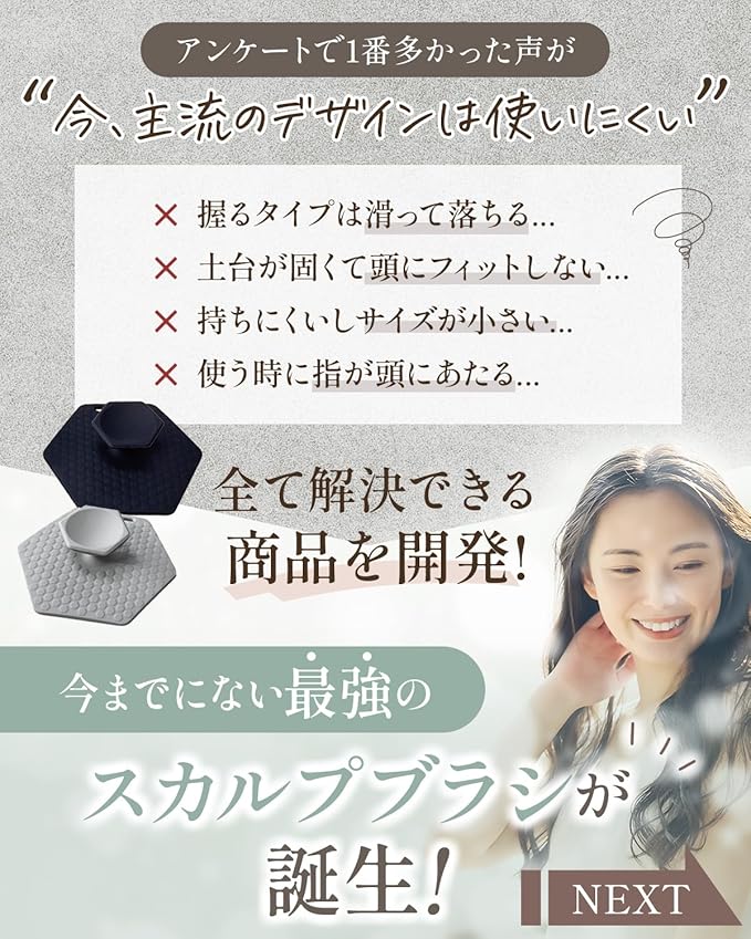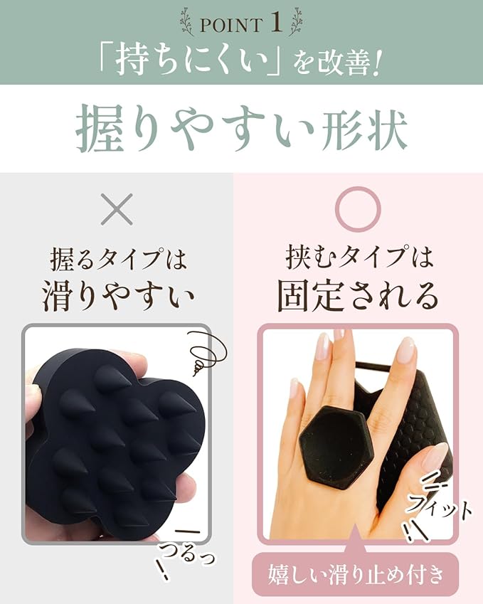 ✅【予防診断士と共同開発】予防診断士の文倉有希子さんと共同開発「毎日使う物だから、使いやすく頭皮にも優しい高品質シリコン素材のスカルプブラシを作成しました。指で挟むタイプなのでしっかり固定され女性でも持ちやすい作りになっています。」