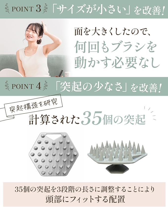 ✅【に基づいたデザインで製作】突起構造を研究し、面を大きくして、35個の突起を配置。頭部にフィットするように突起は3段階の長さに調整しました。また、まんべんなく突起が頭皮にあたるように土台がカーブするようにしました。