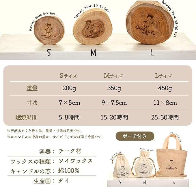 【■商品詳細】●Sサイズ 重量 200g/寸法 7*5cm/燃焼時間 5-8時間●Mサイズ 重量 350g/寸法/9*7.5cm/燃焼時間 15-20時間●Lサイズ 重量 450g/寸法 11*8cm/燃焼時間 25-30時間●ワックスの種類:ソイワックス●キャンドルの芯:綿100%●香りの種類:10種類。花びらや果実の皮、植物のさまざまな部分から抽出した天然のエッセンシャルオイルを使用●生産国:タイ●パッケージ:チーク材(天然木のため1個1個大きさが不揃いになります)●専用ポーチ付き