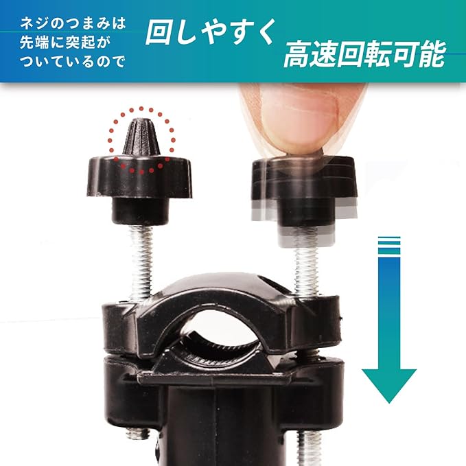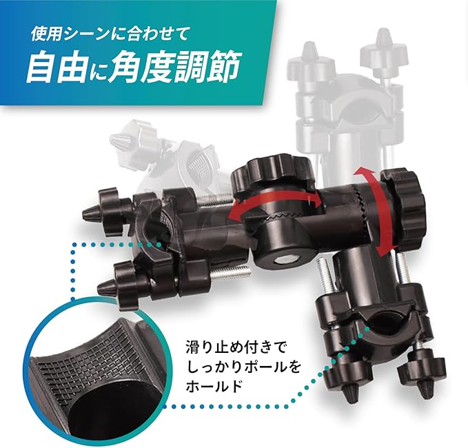 【特長】:ホールド部は網目状の凹凸があり、しっかりポールをホールドします。ホールド時に使用する調整つまみは先端が突起状になっており、高速で仮止め状態まで締めることが可能です。最後は大きなつまみで力を加えてしっかり固定します。