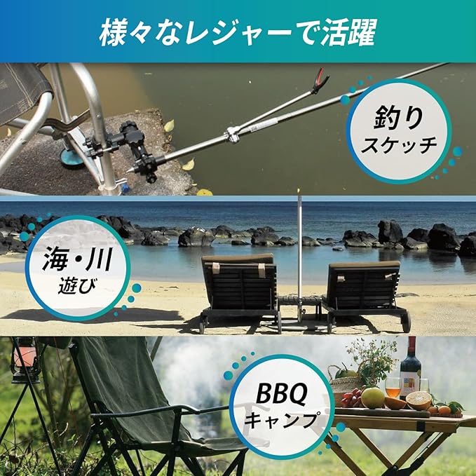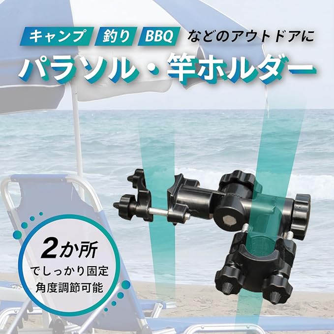【商品概要】:高品質ABS製 2か所で角度調整可能なパラソルホルダーです。ジョイント部分は約360 回転することが可能で、お好きな角度での固定が可能です。釣りやキャンプ、レジャーなどのアウトドアに最適です。