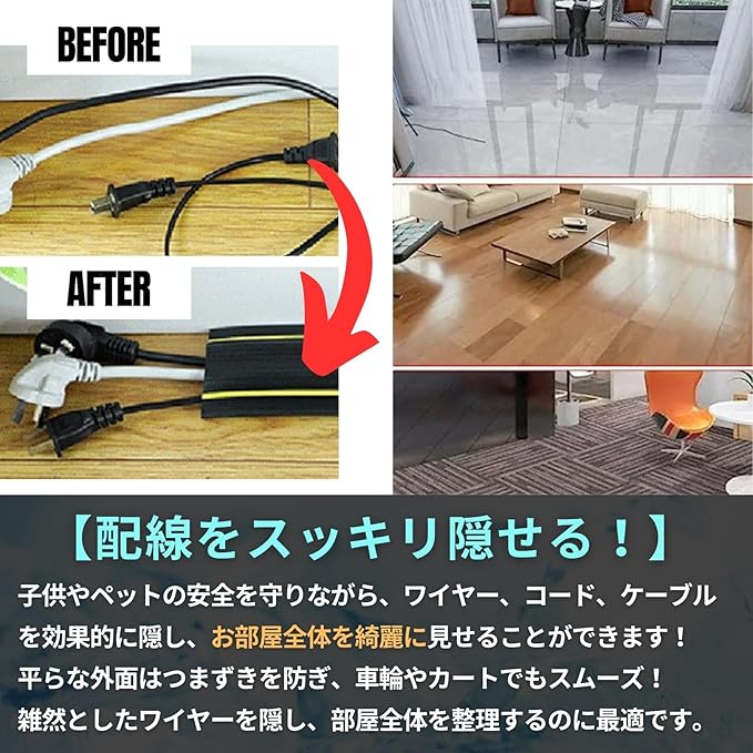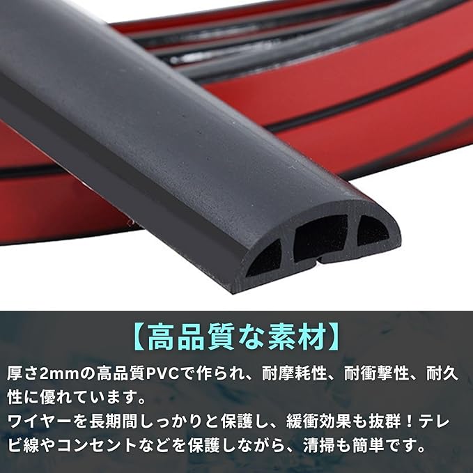 【良質の素材】厚さ2mmの高品質なPVC材料で作られたフロアコードプロテクター、フロアカバーは、耐摩耗性、耐衝撃性、耐久性に優れています。ワイヤーを長期間しっかりと保護し、緩衝効果も抜群。ケーブルカバーがワイヤーを完全に包み込み、テレビ線やコンセントなどをオールラウンドに保護し、清掃も簡単です。