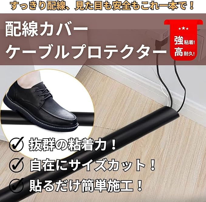 【床の美観を保ちながら、配線をスッキリ隠せるカバー!】子供やペットの安全を守りながら、スマートに整理されたインテリアを実現する配線隠し・ケーブルカバーです。このケーブルプロテクターで、ワイヤー、コード、ケーブルを効果的に隠し、フローリングや床の生活感を払拭、お部屋全体を整理し綺麗に見せることができます。平らな外面はつまずきを防ぎ、車輪やカートがスムーズに転がることができます。雑然としたワイヤーを隠し、部屋全体を整理するのに最適です。