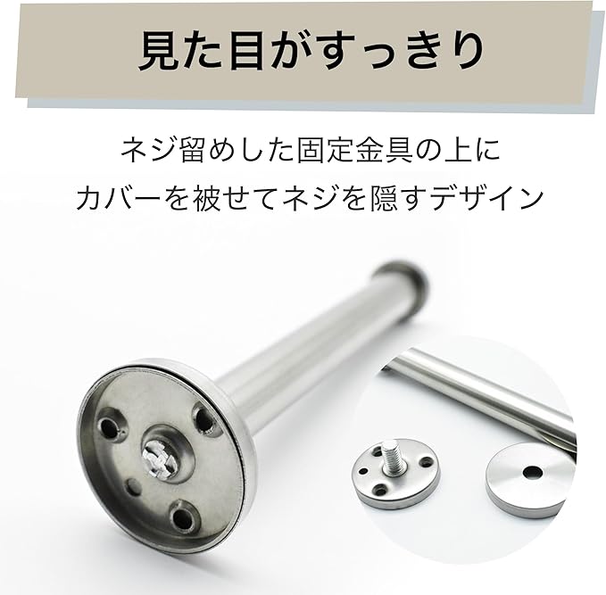 留め具のネジが隠れるので、見た目がすっきり:こちらのフックはネジで壁に取り付けるタイプですが、専用のネジが付属していますので、到着してすぐに設置できます。ネジ留めした固定金具の上にカバーを被せてネジを隠すデザインで、すっきりした見た目も人気です。