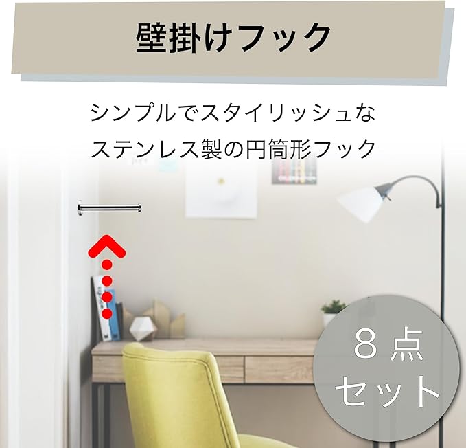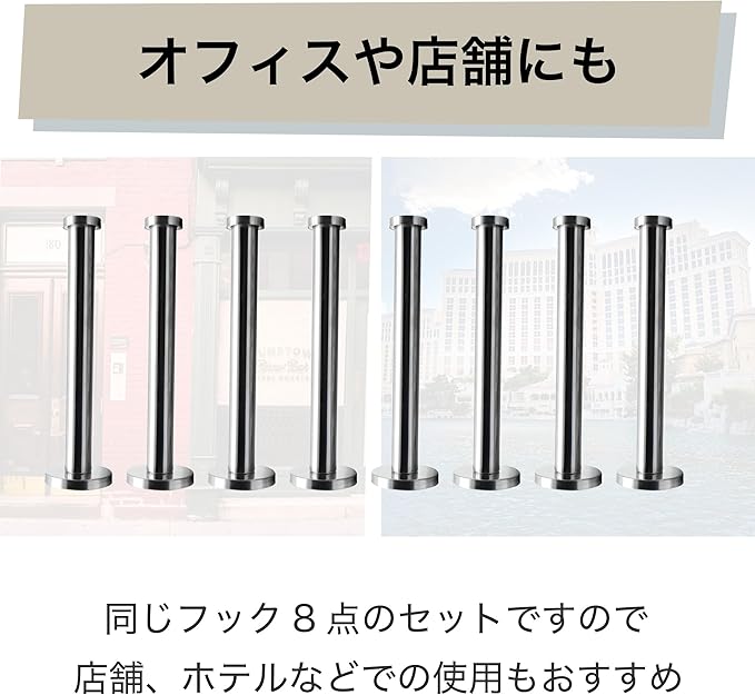 8点セットなので、オフィスや店舗での使用もおすすめ:こちらは同じフック8点のセットですので、ご家庭だけでなく、オフィス、店舗、ホテルなどでの使用もおすすめ。カフェやレストランでお客様のコートやバッグを掛けるフックとして使用することもできます。